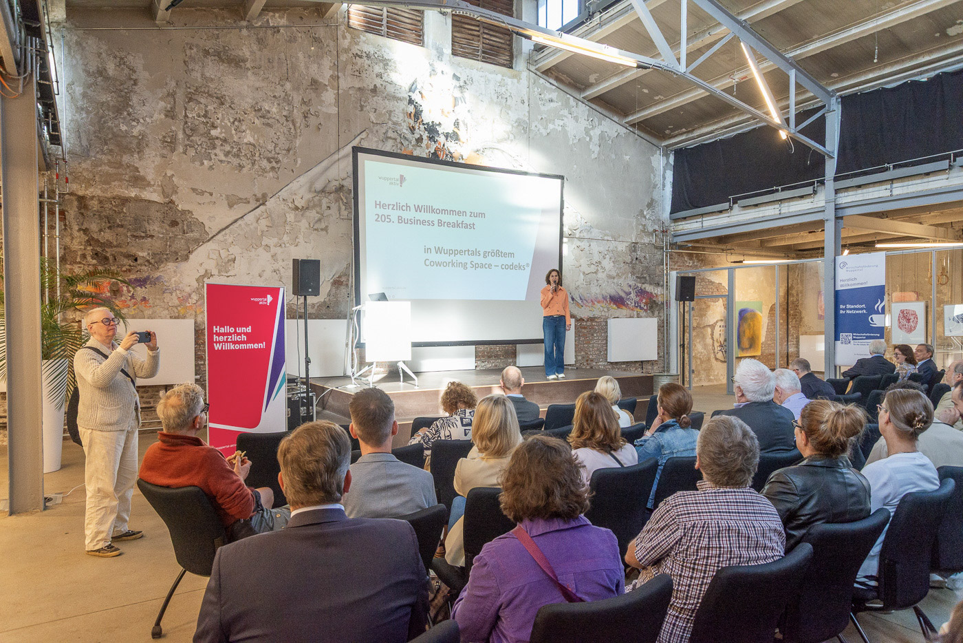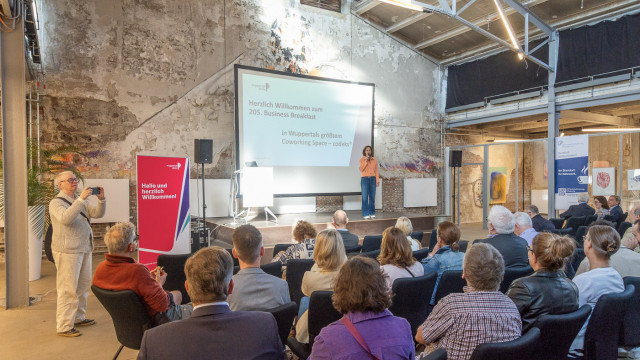 New Work in Wuppertal – was 2018 noch Überzeugungsarbeit kostete, erfreut sich heute großer Beliebtheit bei Kreativen, Solo-Selbstständigen, Startups und Kleinunternehmen. Beim Business Breakfast, dem morgendlichen Netzwerktreffen des Stadtmarketingvereins wuppertalaktiv! und der Wirtschaftsförderung, begrüßte Antje Lieser die Gäste im größten Coworking-Space der Stadt. „Beim letzten Business Breakfast vor der Sommerpause, sind wir nochmal dort, wo richtig gearbeitet wird“. Hier wachsen viele neue Ideen. Und auch die Immobilie selbst, ist ein Beispiel für Wandel und Kreativität. „Hier waren früher die Elba-Fabrikhallen. Ein tolles Beispiel für die Gebäude-Reaktivierung in Wuppertal“, so Lieser.